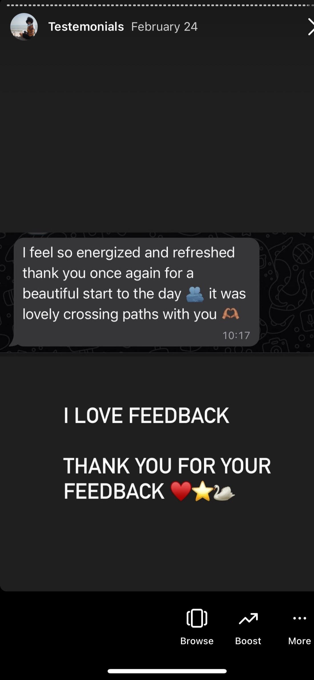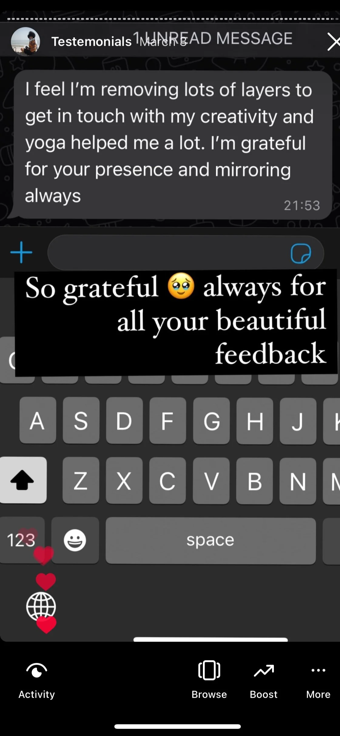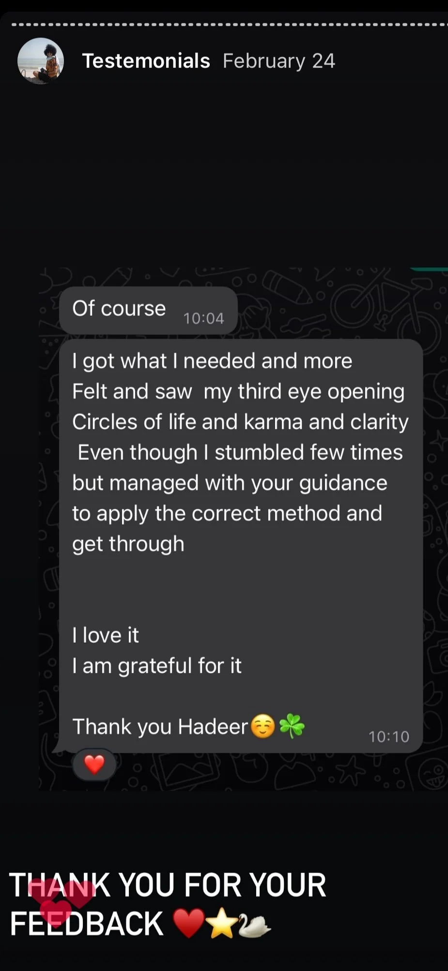 “I find it such a beautiful experience. I think the only thing maybe to consider because your circle is getting bigger ans bigger that maybe a headset mic for you and the other practicionar (only if when you experience heavy winds that cut through your beautiful voice). I love you and I hope you have a wonderful day. I miss youu