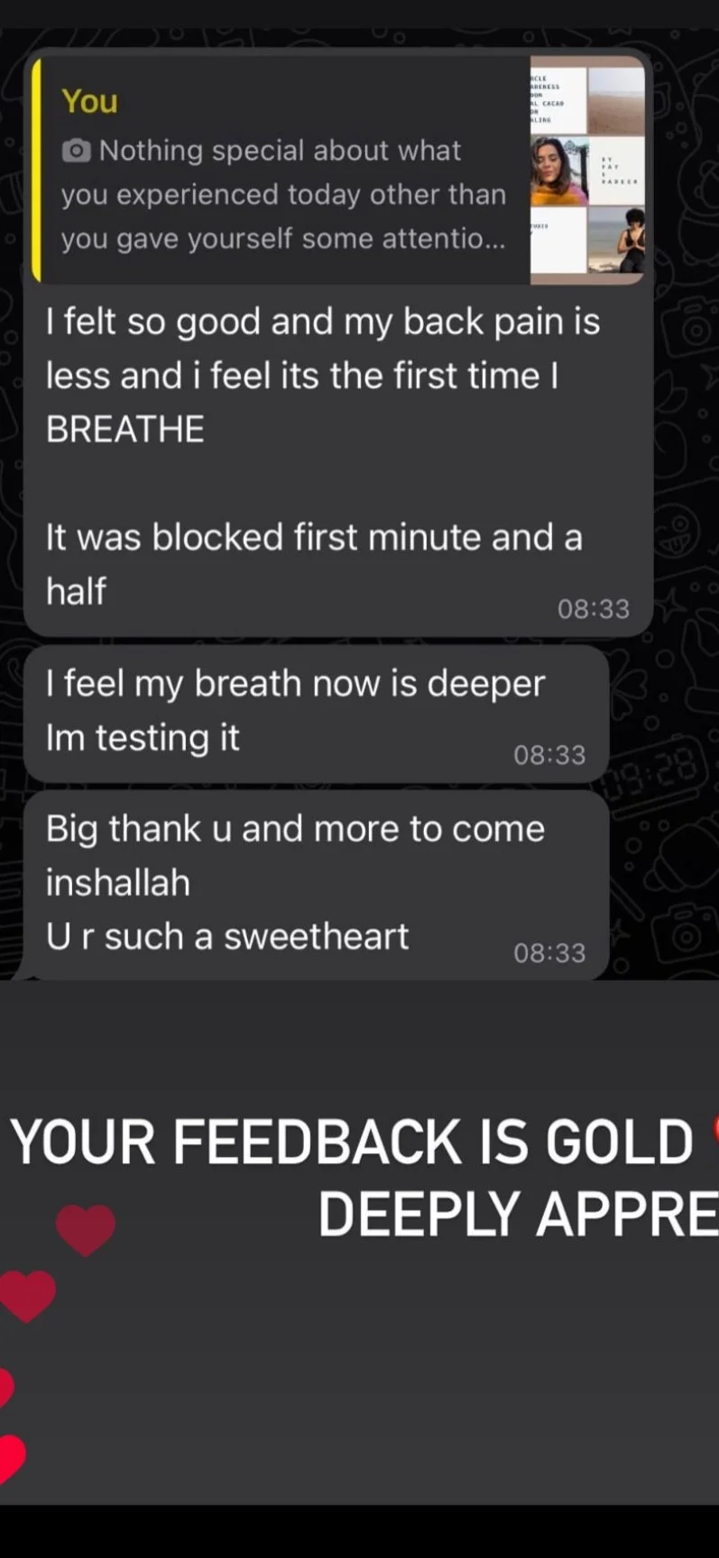 , the feeling that I had prior to the session was calm but after the session I felt much lighter and I felt I could breathe properly and that I wasn’t doing , the abdomen breathing very well, she started the session with explaining all different aspects and breathing mode, and what each part did after that was the practical side where she showed me different ways of breathing addition of spinal breathing, which helps release all accumulated emotions. I released a couple of tears and felt energy, vibrating all through my body, a mix between tiredness and excitement, tiredness and stimulation flow with embracing beautiful, cloudy weather, and the sound of the waves in the background, in addition to the mantras, that were there, we concluded the session, with the singing bowl frequency portrayed different colors vibrations and I can see different colors depending on each note my body was vibrating from the inside out to the frequencies and I bathed from the inside. I feel out calm and relax, and. much lighter.
