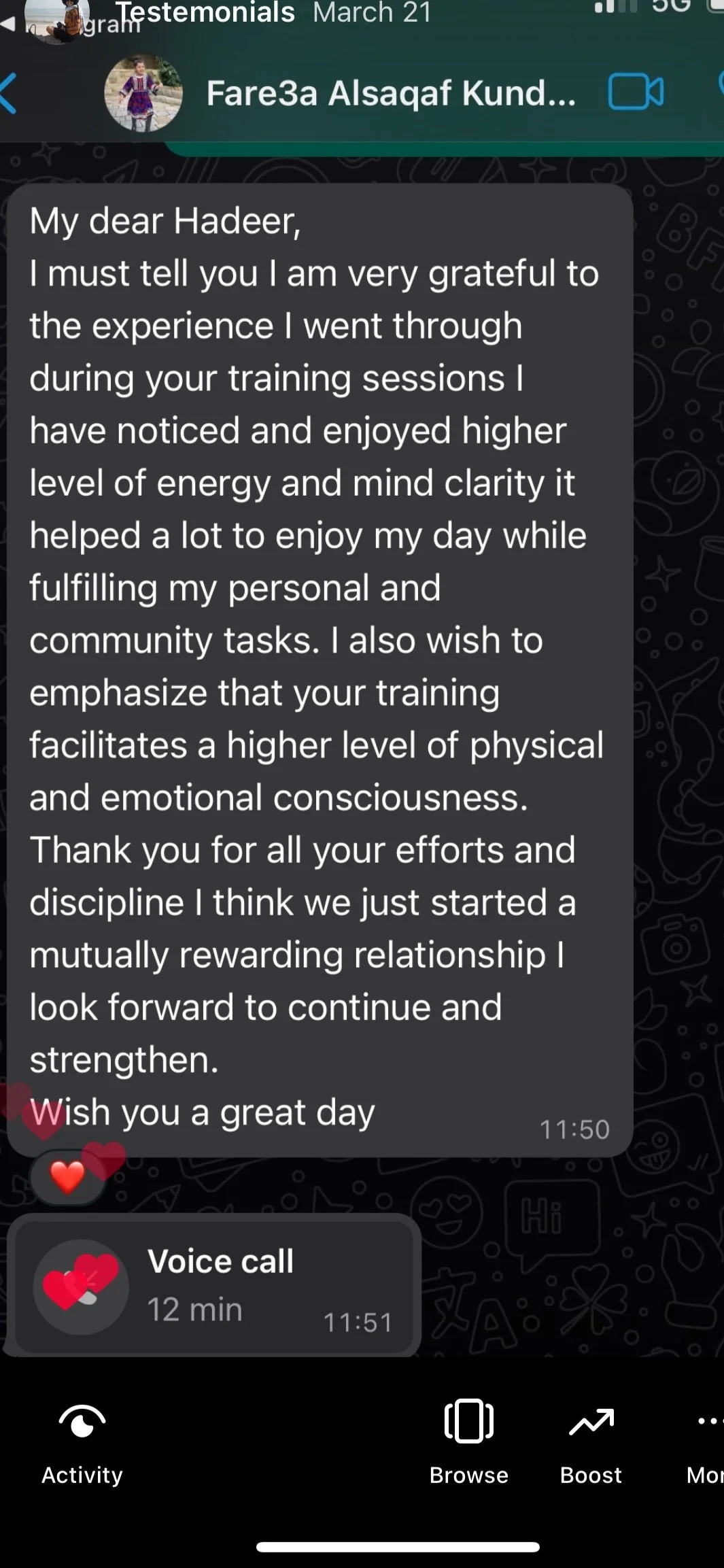 I must tell you I am very grateful to the experience I went through during your training sessions I have noticed and enjoyed higher level of energy and mind clarity it helped a lot to enjoy my day while fulfilling my personal and community tasks. I also wish to emphasize that your training facilitates a higher level of physical and emotional consciousness.