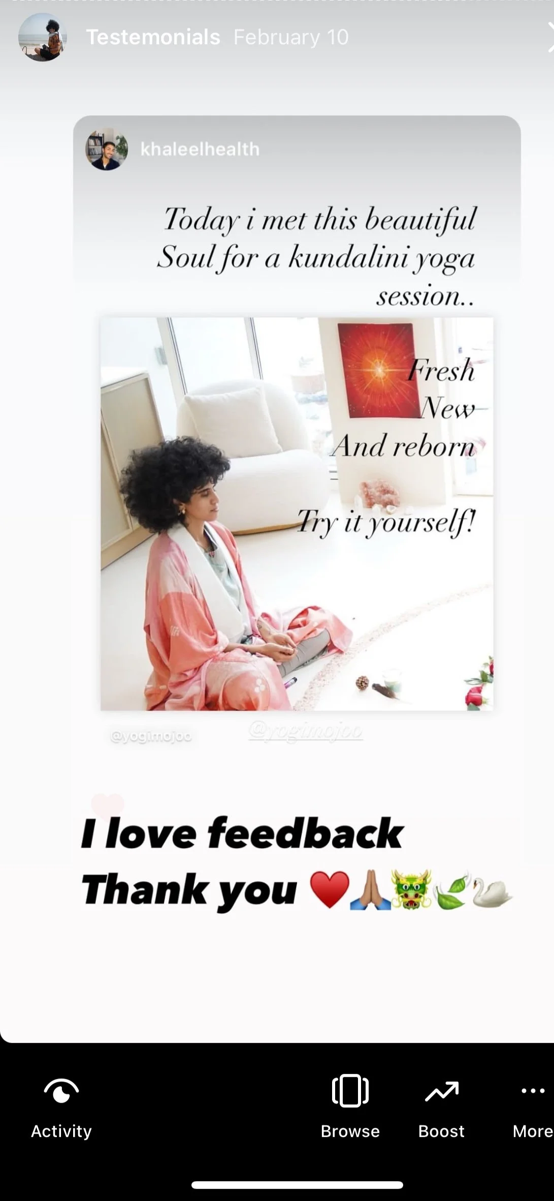 “Thanks for Friday morning with kundalini yoga and Soundbath. It was really a success.